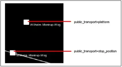 Darauf ist zu sehen, dass eine Haltstelle aus einem Node mit dem Tag public_transport=stop_position und aus einem Node mit dem Tag public_transport=platform. Bei der Platform kann es sich wie bei einem Bahnsteig auch um eine richtige Platform also um eine Linie handeln. Dies verhält sich aber genau so wie der Node später in der Relation.