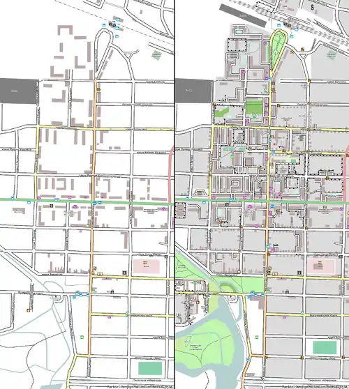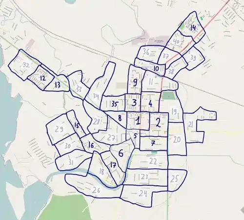 Вышний Волочёк — город малоэтажной застройки. При этом все основные магазины и другие заведения сконцентрированы вдоль трассы, всего в нескольких кварталах. Поэтому в пироге куски двух типов: классические, где нужно обойти несколько кварталов, и малоэтажные, где нужно пройти вдоль улиц и собрать адреса с немногочисленными POI.