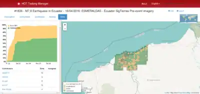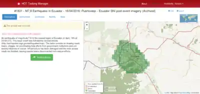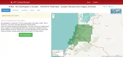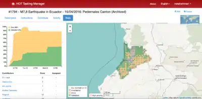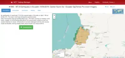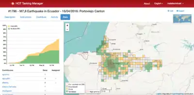 - 17 April - First Mapping Projects released with guidance of OSM Ecuador community members. Initial HOT Size-up as Moderate Event with Local Leadership - HOT defers standing-up team to continue support for this response as well as to Japan earthquakes on 14th and 15th.