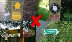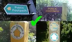 Typically marked by signposts bearing yellow arrows, wooden pointers, or yellow waymark arrows attached to posts. Look out for the words "public footpath" on the guidepost or on the surround of the waymark arrow to be certain that the way can be tagged as a public footpath: