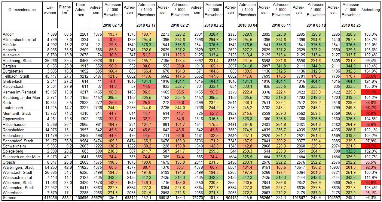 | Gemeindename | Einwohner | Fläche km2 | Theor. Adressen | 2018-02-13 | 2018-02-25 | 2018-03-25 |