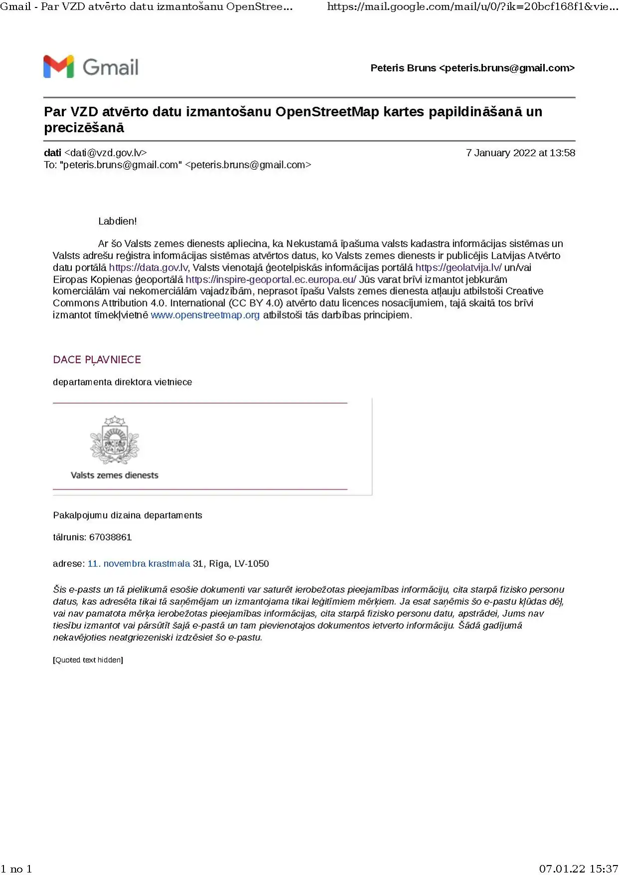 Delivered-To: [email protected] Received: by 2002:a02:cc9c:0:0:0:0:0 with SMTP id s28csp204143jap; Fri, 7 Jan 2022 03:58:05 -0800 (PST) X-Google-Smtp-Source: ABdhPJyQQb5mix4CYAmnOTpj+u6IgJu//sMLOBQOskFZlBbTWIwmGIQxLWX+lFQjH3kdEK+8vPV9 X-Received: by 2002:a05:6512:10d0:: with SMTP id k16mr57699890lfg.97.1641556684926; Fri, 07 Jan 2022 03:58:04 -0800 (PST) ARC-Seal: i=1; a=rsa-sha256; t=1641556684; cv=none; d=google.com; s=arc-20160816; b=hudsxMucoih2dAe28d6c5pzeUioCQAZDm9zIgTy7IpLWeFEBHANbLeEjoBHW9TGxyB M0rNE33t6fPIo7FzPvFyOsN+sGFWTRTkIc+N042bCxoGMPrWFn5e3+6GC/7d6WlaCjUa y0JY4bRX6u48BgRq/glBa4KHkTVyfqOP18nIvNC0BitHUTtMnTrnSFhJmUSLqIQxB9BR juJDcyfxvnwKK5UFK4NaQwIZ02FUrL2Kmmf8sl5laQ0SoElGQKCbgMf8oiiA/G5K6Mqc QvhwIeTwueBnCXrZbzebnzbiaPz0iYs31Opc6YeW2Rwj9s0GSHMfgeo8oSTkOZAJuvet QJtA== ARC-Message-Signature: i=1; a=rsa-sha256; c=relaxed/relaxed; d=google.com; s=arc-20160816; h=mime-version:content-language:accept-language:in-reply-to :references:message-id:date:thread-index:thread-topic:subject:to :from; bh=XyLyH5LhInSkEl0Ijb5N44C/dWADJuBUXvw8z23zros=; b=myTUCUBZeYoQD+sGT7D7pWcuXE2m/r6jhA4y04/KJeEwVAqwWQNqEkCPjw2jZ0AZbp ER7r9zEDRsYw0vurVx7vhJ7v+1++RyxuPoYpU2OC7zXpEv2Z/BeoPHGx2wPpRomD13K3 5EAxYN7uK0JsT5rFSuu4l5fqYgh8YzsXqX76ag7mRkUZpvNgmrVHRx66HflXOz2ID09E ngNozkf1tN9pgUYdeklrJ6ePfvePWVsXkihlVKg6bhS3EzOgtQClg4cHV+KAo/eyg1k4 XP9H6iWZaRmRCH8psSiAKYBmS+/GGKlcwm8Y10ZgUJK5OtNtIelJ975NcetYi+w3c0SM qTjg== ARC-Authentication-Results: i=1; mx.google.com; spf=pass (google.com: domain of [email protected] designates 87.246.184.20 as permitted sender) [email protected]; dmarc=pass (p=QUARANTINE sp=QUARANTINE dis=NONE) header.from=vzd.gov.lv Return-Path: <[email protected]> Received: from mail.vzd.gov.lv (mail.vzd.gov.lv. [87.246.184.20]) by mx.google.com with ESMTPS id i8si5069849lfu.348.2022.01.07.03.58.04 for <[email protected]> (version=TLS1_2 cipher=ECDHE-ECDSA-AES128-GCM-SHA256 bits=128/128); Fri, 07 Jan 2022 03:58:04 -0800 (PST) Received-SPF: pass (google.com: domain of [email protected] designates 87.246.184.20 as permitted sender) client-ip=87.246.184.20; Authentication-Results: mx.google.com; spf=pass (google.com: domain of [email protected] designates 87.246.184.20 as permitted sender) [email protected]; dmarc=pass (p=QUARANTINE sp=QUARANTINE dis=NONE) header.from=vzd.gov.lv Received: from EX2016.it.vzd.gov.lv (10.195.0.32) by EX2016.it.vzd.gov.lv (10.195.0.32) with Microsoft SMTP Server (version=TLS1_2, cipher=TLS_ECDHE_RSA_WITH_AES_128_GCM_SHA256) id 15.1.2375.17; Fri, 7 Jan 2022 13:58:04 +0200 Received: from EX2016.it.vzd.gov.lv ([::1]) by EX2016.it.vzd.gov.lv ([::1]) with mapi id 15.01.2375.017; Fri, 7 Jan 2022 13:58:04 +0200 From: dati <[email protected]> To: "'[email protected]'" <[email protected]> Subject: =?utf-8?B?UGFyIFZaRCBhdHbEk3J0byBkYXR1IGl6bWFudG/FoWFudSBPcGVuU3RyZWV0?= =?utf-8?B?TWFwIGthcnRlcyBwYXBpbGRpbsSBxaFhbsSBIHVuIHByZWNpesSTxaFhbsSB?= Thread-Topic: =?utf-8?B?UGFyIFZaRCBhdHbEk3J0byBkYXR1IGl6bWFudG/FoWFudSBPcGVuU3RyZWV0?= =?utf-8?B?TWFwIGthcnRlcyBwYXBpbGRpbsSBxaFhbsSBIHVuIHByZWNpesSTxaFhbsSB?= Thread-Index: AQHYAaMQ3uH17AVjFkiEd47dbyCQPqxT72kQgAALb0CAA0Nw4IAAN+nQgAAB9dA= Date: Fri, 7 Jan 2022 11:58:03 +0000 Message-ID: <[email protected]> References: <CAHYTP7ceBD2QywZDL3LJRX7ny1vHVgCEeOMuspBTYQEwDG4=Dw@mail.gmail.com> <[email protected]> <[email protected]> <[email protected]> <[email protected]> In-Reply-To: <[email protected]> Accept-Language: lv-LV, en-US Content-Language: lv-LV X-MS-Has-Attach: yes X-MS-TNEF-Correlator: x-originating-ip: [10.195.8.83] Content-Type: multipart/related; boundary="_004_21b78c5593bd4bc1bdeeeb1fe8fd0b31vzdgovlv_"; type="multipart/alternative" MIME-Version: 1.0 --_004_21b78c5593bd4bc1bdeeeb1fe8fd0b31vzdgovlv_ Content-Type: multipart/alternative; boundary="_000_21b78c5593bd4bc1bdeeeb1fe8fd0b31vzdgovlv_" --_000_21b78c5593bd4bc1bdeeeb1fe8fd0b31vzdgovlv_ Content-Type: text/plain; charset="utf-8" Content-Transfer-Encoding: base64 DQogICAgICAgICAgICAgICAgTGFiZGllbiENCiAgICAgICAgICAgICAgICBBciDFoW8gVmFsc3Rz IHplbWVzIGRpZW5lc3RzIGFwbGllY2luYSwga2EgTmVrdXN0YW3EgSDEq3BhxaF1bWEgdmFsc3Rz IGthZGFzdHJhIGluZm9ybcSBY2lqYXMgc2lzdMSTbWFzIHVuIFZhbHN0cyBhZHJlxaF1IHJlxKNp c3RyYSBpbmZvcm3EgWNpamFzIHNpc3TEk21hcyBhdHbEk3J0b3MgZGF0dXMsIGtvIFZhbHN0cyB6 ZW1lcyBkaWVuZXN0cyBpciBwdWJsaWPEk2ppcyBMYXR2aWphcyBBdHbEk3J0byBkYXR1IHBvcnTE gWzEgSBodHRwczovL2RhdGEuZ292Lmx2LCBWYWxzdHMgdmllbm90YWrEgSDEo2VvdGVscGlza8SB cyBpbmZvcm3EgWNpamFzIHBvcnTEgWzEgSBodHRwczovL2dlb2xhdHZpamEubHYvIHVuL3ZhaSBF aXJvcGFzIEtvcGllbmFzIMSjZW9wb3J0xIFsxIEgaHR0cHM6Ly9pbnNwaXJlLWdlb3BvcnRhbC5l Yy5ldXJvcGEuZXUvIErFq3MgdmFyYXQgYnLEq3ZpIGl6bWFudG90IGplYmt1csSBbSBrb21lcmNp xIFsxIFtIHZhaSBuZWtvbWVyY2nEgWzEgW0gdmFqYWR6xKtixIFtLCBuZXByYXNvdCDEq3BhxaF1 IFZhbHN0cyB6ZW1lcyBkaWVuZXN0YSBhdMS8YXVqdSBhdGJpbHN0b8WhaSBDcmVhdGl2ZSBDb21t b25zIEF0dHJpYnV0aW9uIDQuMC4gSW50ZXJuYXRpb25hbCAoQ0MgQlkgNC4wKSBhdHbEk3J0byBk YXR1IGxpY2VuY2VzIG5vc2FjxKtqdW1pZW0sIHRhasSBIHNrYWl0xIEgdG9zIGJyxKt2aSBpem1h bnRvdCB0xKttZWvEvHZpZXRuxJMgd3d3Lm9wZW5zdHJlZXRtYXAub3JnPGh0dHA6Ly93d3cub3Bl bnN0cmVldG1hcC5vcmc+IGF0Ymlsc3RvxaFpIHTEgXMgZGFyYsSrYmFzIHByaW5jaXBpZW0uDQoN CkRhY2UgUMS8YXZuaWVjZQ0KZGVwYXJ0YW1lbnRhIGRpcmVrdG9yYSB2aWV0bmllY2UNCltjaWQ6 aW1hZ2UwMDEuZ2lmQDAxRDgwM0NELkExMjVENUUwXQ0KUGFrYWxwb2p1bXUgZGl6YWluYSBkZXBh cnRhbWVudHMNCnTEgWxydW5pczogNjcwMzg4NjENCmFkcmVzZTogMTEuIG5vdmVtYnJhIGtyYXN0 bWFsYSAzMSwgUsSrZ2EsIExWLTEwNTANCsWgaXMgZS1wYXN0cyB1biB0xIEgcGllbGlrdW3EgSBl c2/FoWllIGRva3VtZW50aSB2YXIgc2F0dXLEk3QgaWVyb2Jlxb5vdGFzIHBpZWVqYW3Eq2JhcyBp bmZvcm3EgWNpanUsIGNpdGEgc3RhcnDEgSBmaXppc2tvIHBlcnNvbnUgZGF0dXMsIGthcyBhZHJl c8STdGEgdGlrYWkgdMSBIHNhxYbEk23Ek2phbSB1biBpem1hbnRvamFtYSB0aWthaSBsZcSjaXTE q21pZW0gbcSTcsS3aWVtLiBKYSBlc2F0IHNhxYbEk21pcyDFoW8gZS1wYXN0dSBrxLzFq2RhcyBk xJPEvCwgdmFpIG5hdiBwYW1hdG90YSBtxJNyxLdhIGllcm9iZcW+b3RhcyBwaWVlamFtxKtiYXMg aW5mb3JtxIFjaWphcywgY2l0YSBzdGFycMSBIGZpemlza28gcGVyc29udSBkYXR1LCBhcHN0csSB ZGVpLCBKdW1zIG5hdiB0aWVzxKtidSBpem1hbnRvdCB2YWkgcMSBcnPFq3TEq3QgxaFhasSBIGUt cGFzdMSBIHVuIHRhbSBwaWV2aWVub3Rham9zIGRva3VtZW50b3MgaWV0dm