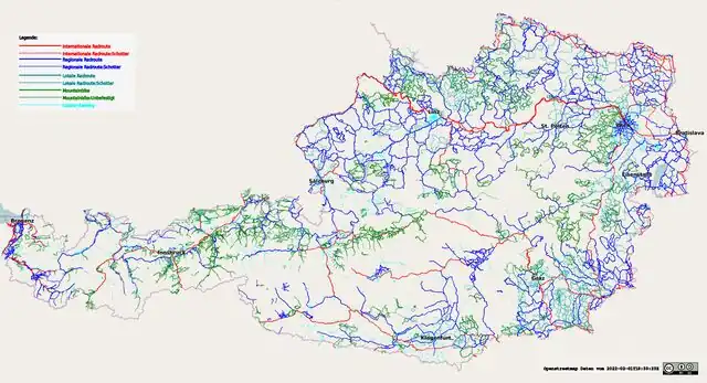 | EV9a | Bernsteinradweg, alternativer Verlauf | Niederösterreich, Wien | 54 km | 1196886 | ||