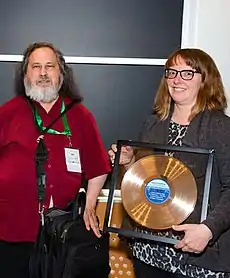 FSF president Richard M. Stallman presented the 'Award for Projects of Social Benefit' to Kate Chapman, chairperson of the OpenStreetMap Foundation and co-founder of the Humanitarian OpenStreetMap Team (HOT), during the LibrePlanet 2019 conference at the Massachusetts Institute of Technology.