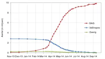 Voortgang van de BAG-import: aantal gebouwen met de aangegeven source tags in Nederland sinds november 2013.