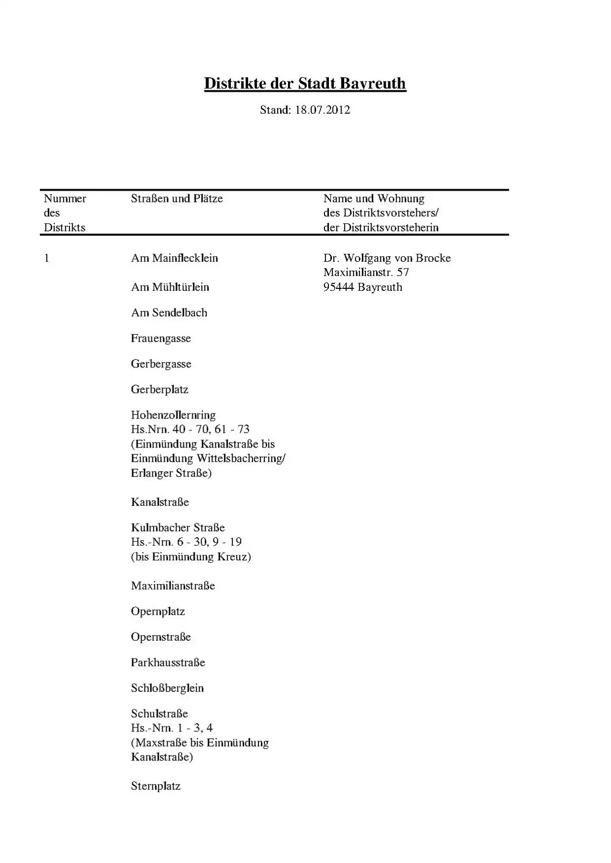 Das Stadtgebiet von Bayreuth ist in 39 Distrikte unterteilt, jeder Distrikt hat jeweils einen Distriktvorsteher(in). Laut Auskunft der Stadt Bayreuth gibt es keine explizite Karte mit den Grenzen der Distrikte, die Einteilung in die Distrikte erfolgt anhand von Straßen und Hausnummern. Unter