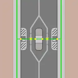 Für Querungen, die zwar nicht im Bereich des fließenden Verkehrs (in der Straßenmitte), aber am Fahrbahnrand mit Markierungen versehen sind. Werte für crossing:buffer_marking=*: both für Markierungen an beiden Straßenseiten, left/right für einseitige Markierungen (je nach Linienrichtung der Straße, vgl. oben: Gehwegvorstreckungen), yes wenn nicht weiter bestimmt/erkennbar.