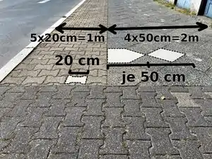 - width=*: Gehwegbreite (möglichst vor Ort messen oder anhand der Breite von Gehwegsteinen abschätzen: siehe Abbildung). Gemeint ist die nutzbare Breite des Gehweges, also abzüglich von Randstreifen und anderen Bereichen, die durch Straßenlaternen, Baumscheiben oder sonstige Straßenmöbel, Gehwegeinbauten und Objekte keine durchgehende Nutzung zulassen. Ist die Breite des Weges bzw. Wegesegments nur an einer Stelle eingeschränkt – z.B. neben einem alleinstehenden Baum, Stromkasten, Außengastronomie o.ä., oder auch durch Poller (barrier=bollard) – kann die abweichende Breite durch einen Punkt mit maxwidth:physical=* angegeben werden.