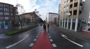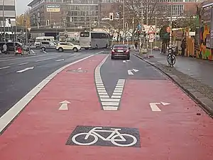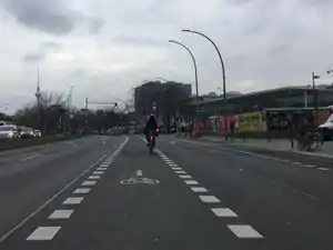 ![]() Geradeaus- und Linksabbiegespur (erst kurz vor der Kreuzung) für Radfahrende. |