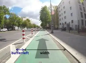 cycleway:buffer=* bzw. cycleway:buffer:left=* cycleway:buffer:right=* oder bei mehrspurigen Straßen analog zur oben genannten Art der Abgrenzung: cycleway:left:buffer:left=* cycleway:left:buffer:right=* cycleway:right:buffer:left=* cycleway:right:buffer:right=* |