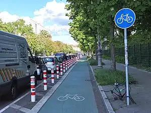 - Protected Bike Lane (Geschützter Radfahrstreifen, durch Barrieren wie Poller geschützte Radwege):