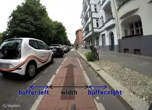 Ist nur buffer (ohne Suffix :left oder :right) angegeben, ist der Abstand nach links zur Fahrbahn gemeint. Nach Möglichkeit sollten aber beide Seiten angegeben werden. buffer:right ist insbesondere als Schutzabstand links neben parkenden Autos (Gefahr durch sich öffnende Autotüren) oder in Gehwegnähe neben dem Fußverkehr interessant. |