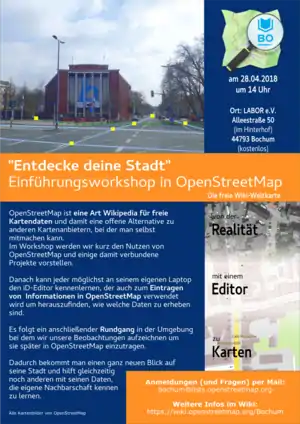 28. April 2018 (Workshop)Wer kommt als UnterstützerVielen Dank an alle Teilnehmer und Unterstützer. Weiteren Austausch über den Verlauf des Workshops gibt es beim kommenden Treffen der Gruppe. Für alle, die dabei waren oder gerne dabei sein wollten, nochmal der Hinweis, sich auf der Mailingliste einzutragen. Ankündigung: "Entdecke deine Stadt" - Einführungsworkshop in OpenStreetMap Plakat Präsentation (ODP) Präsentation (PDF) Waren da: