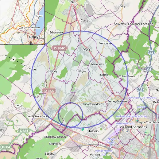 The LHC covers a much larger area, with most of it located in France; it is built under several other communes in Switzerland (Collex-Bossy) and France (Versonnex, Cessy, Échenevex, Crozet and Sergy); three other communes in France (Chevry, Ségny, Maconnex) are also enclosed in this area and are hosting facilities connected to the LHC.