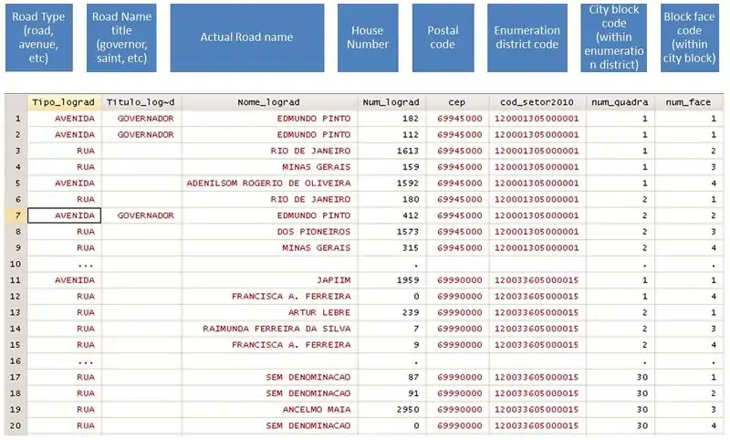 The address is divided into several fields (see image) including: road type (road, avenue, highway. etc), road name title (president, governor), road name itself, address number in street, postal code and identification number within building. Besides the address information, CNEFE also contains information on the enumeration district code, and block and block face of each address (described bellow), which allow for somewhat locating an approximate area of the address. See image bellow