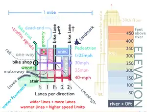 The main portion of the map covers 210 square miles (540 km2) of Hamilton County in Ohio and Kenton and Campbell counties in Kentucky. Streets are coded primarily by width, measured as the number of lanes=* in each direction of travel, and by speed, measured as the posted speed limit in miles per hour (maxspeed=*). Major streets and sets of streets which had no outlet accessible by foot or bicycle were given a degree of transparency. Other street features include traffic signals (highway=traffic_signals) and at-grade railroad crossings (railway=level_crossing). Stairs and service roads were included where they provided possible connections, as determined by Tarjan's algorithm (see below). Dead-ending stairs, service roads, and other minor paths were dropped from the map.