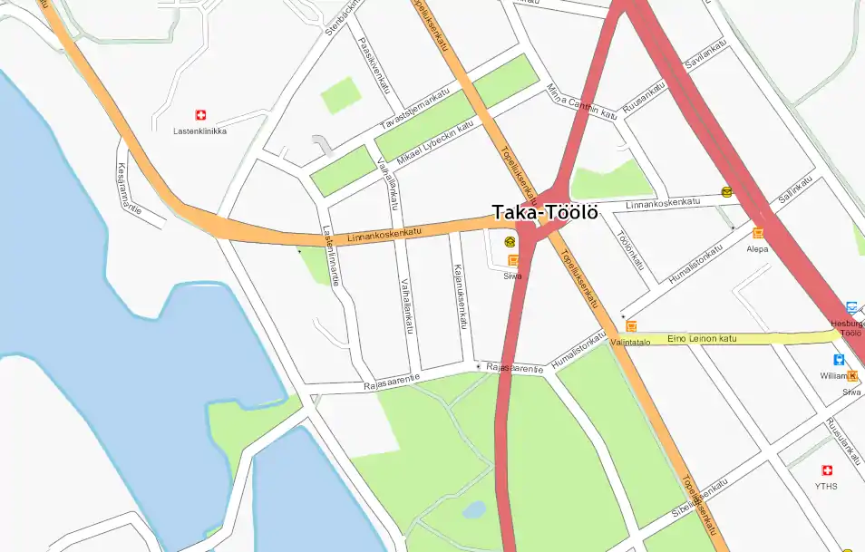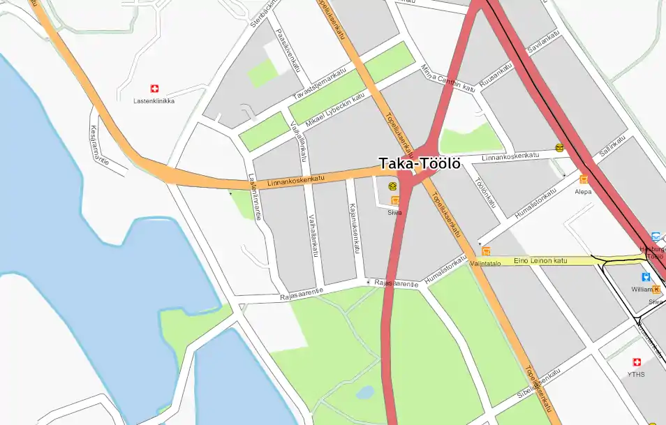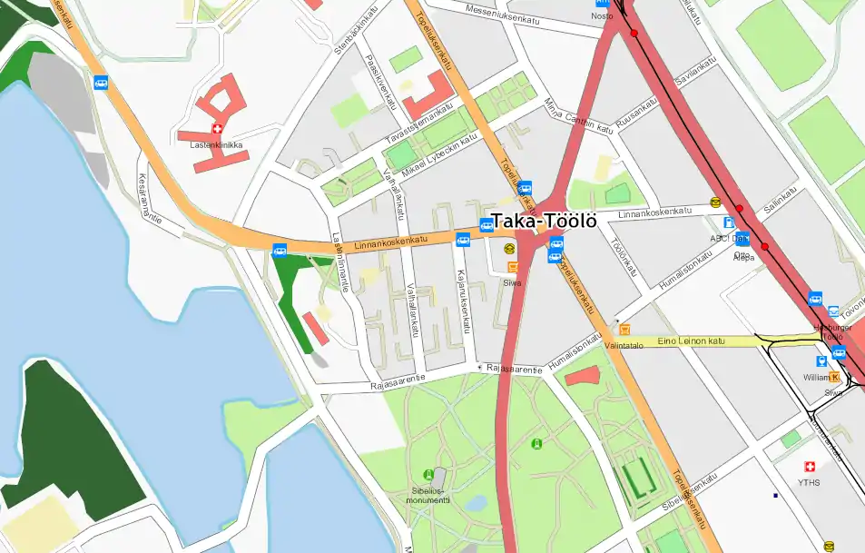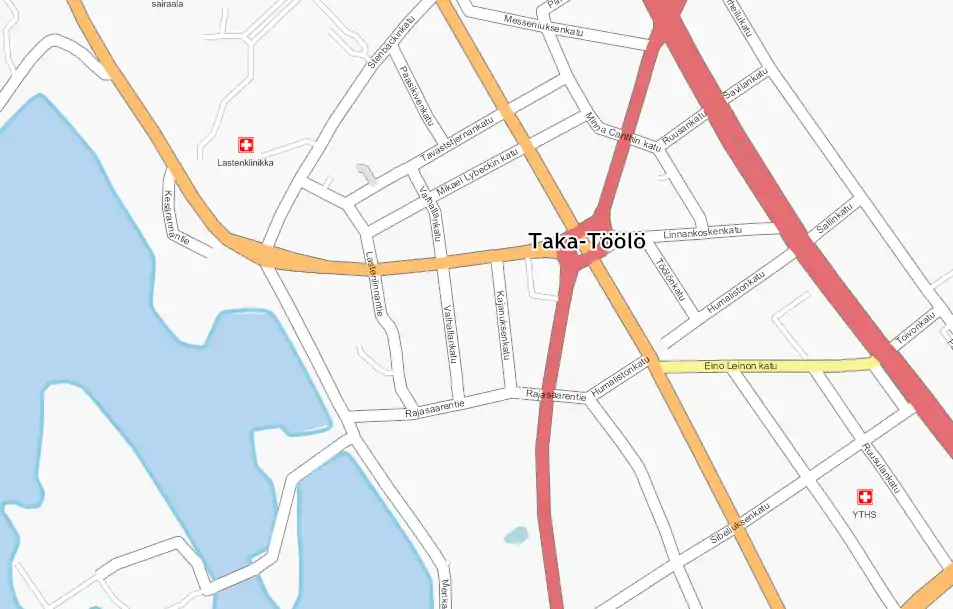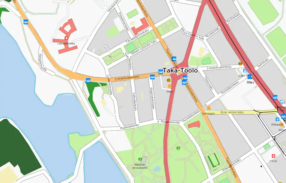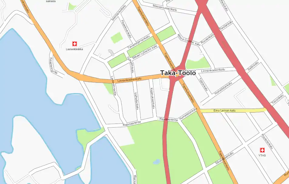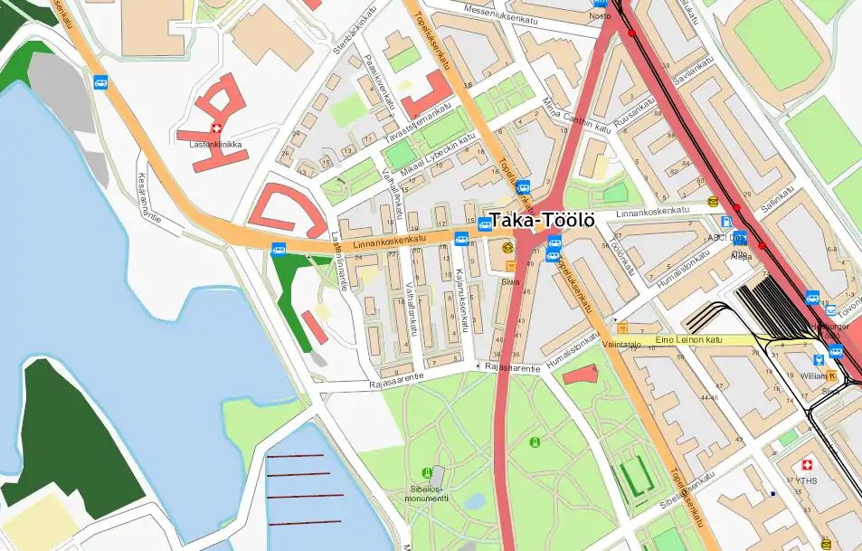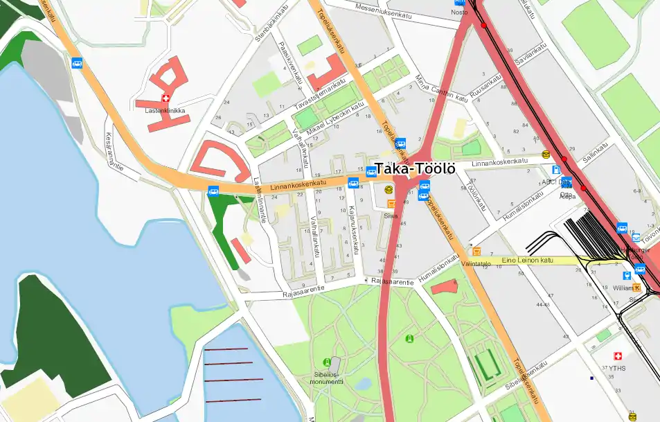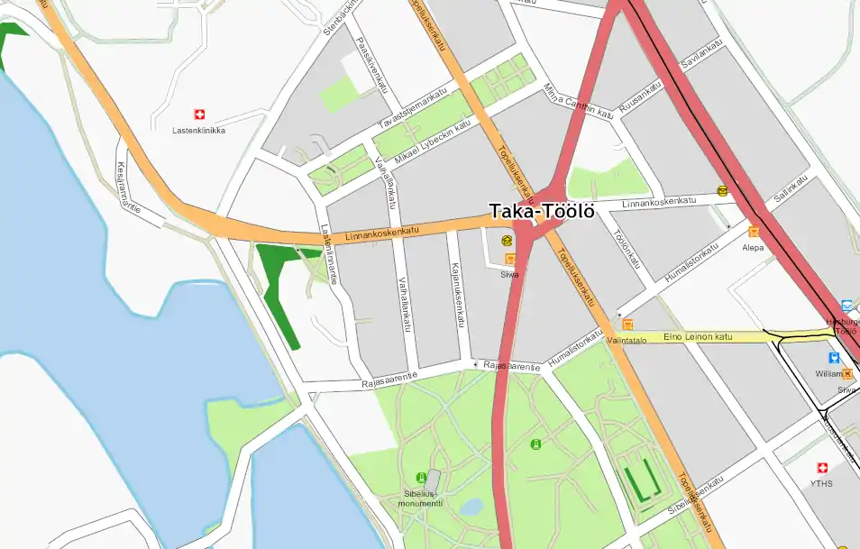 The example depicts a part of Taka-Töölö, the oldest suburb of Helsinki - now considered by most a part of the central area. As Helsinki and the neighboring region was - at the time this was written - the only area with aerial images available and many OSM users back then stated that they live in the city center, this area was likely the most complete area one could find in Finland. The city center itself might have an even bigger data density, but offers less visual elements for this kind of example.