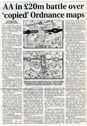 Ordnance Survey Maps sued the Automobile Association for copying their maps and diffusing the results to individuals as well as to third party mappers. Some 26 maps from AA were proven in court to be more or less direct copies of OS maps, or to incorporate data from OS maps. The AA was fined almost million pounds for infringement of copyright. Subsequently, the AA agreed to an out-of-court settlement of £20 million as compensation for other instances of copyright infringement. Compared to this sum, the AA has an annual cash flow of about £30 million.