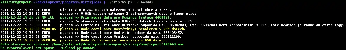 Tento skript načte všechny potřebné údaje z UIR-ZSJ a OSM, provede analýzu duplicit a připraví data ke kontrole a následnému importu. Během tohoto procesu jsou do konzole vypisovány různé údaje, které by měly posloužit k identifikaci případných chyb. Nalezené problémy zahrnují: