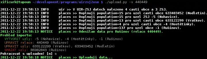 - Porovná výsledná data s originálními, vypíše změny a zeptá se zda pokračovat s uploadem.