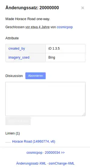 Änderungssatz-Diskussionen sind Kommentare und Antworten (eine Diskussion!), die in der Ansicht der Details eines Änderungssatzes auf der OSM-Website angezeigt werden. Es ist ein guter Ort, um neue Benutzer zu begrüßen und ihnen Tipps zum Mappen zu geben – oder um einen Änderungssatz mit seinem Ersteller zu diskutieren, wenn der Änderungssatz problematisch ist. Weitere Informationen sind ein einem Blogeintrag der OpenStreetMap Foundation zu finden.