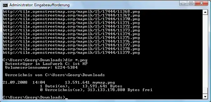 Nachdem man nun im richtigen Verzeichnis ist wird durch den Perl-Befehl: perl mkmap.pl > mymap.png - ENTER der Download der benötigten Tiles gestartet und direkt im Anschluß die Kartendatei erstellt. Das ganze sieht dann so aus.