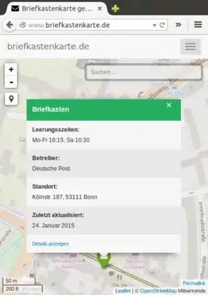 Nutzer konnten ihren Standort positionieren und sich die nächsten Briefkästen in ihrer Umgebung anzeigen lassen. Ein Mapper konnte die Karte dazu verwenden, um sich zu informieren, wo Briefkästen bzw. Leerungszeiten fehlen.