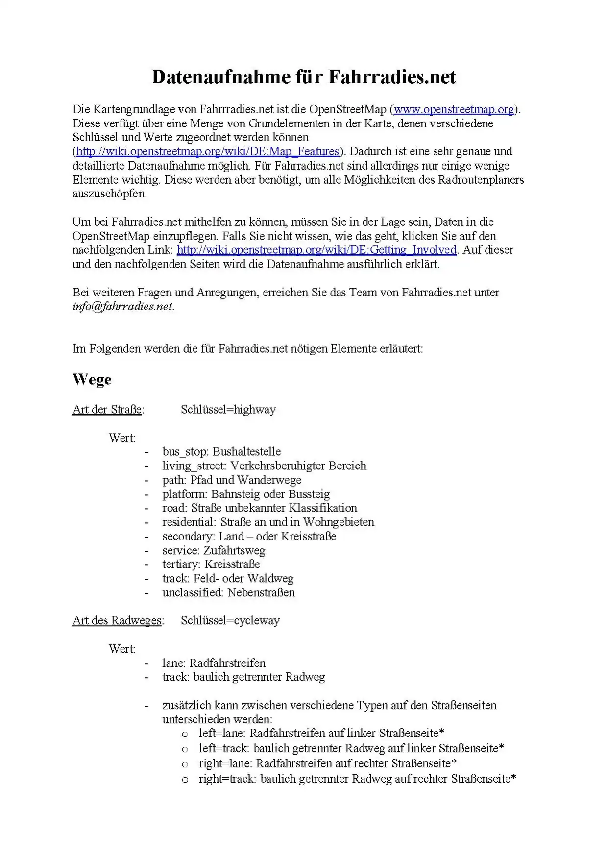 Um alle Funktionen von fahrradies.net nutzen zu können, ist eine exakter und geprüfter Datenbestand nötig. Wenn Sie bei der Datenaufnahme bzw. Kontrolle vorhandener OSM-Daten mithelfen wollen, würde uns dies natürlich sehr freuen. Eine ausführliche Anleitung zur Aufnahme der Daten befindet sich im nachfolgenden PDF-Dokument.