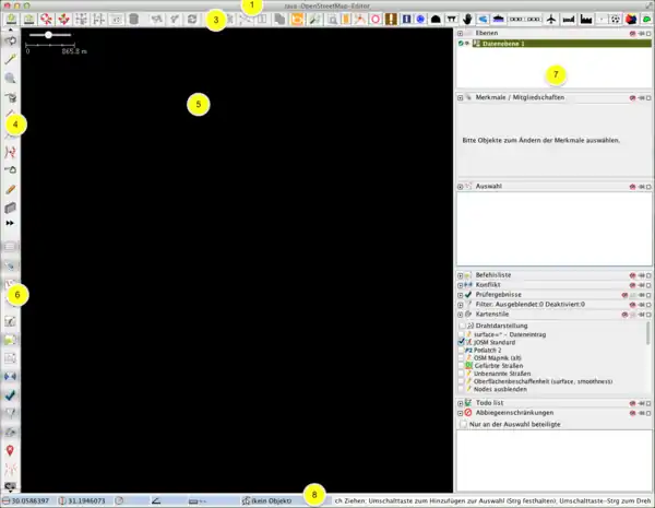 Titelleiste (1)Die Titelleiste (1) ist der oberste Rand des Fenster. Sie zeigt meist den Namen der Anwendung, in unserem Fall Java OpenStreetMap-Editor. Links befindet sich das Systemmenüfeld zum Verschieben, Vergrößern, Verkleinern, Verlassen und Schließen des Fensters. Rechts in der Titelleiste befinden sich die Schaltflächen zum Vergrößern, Verkleinern und Schließen des Fensters. Menüleiste (2)Direkt unter der Titelleiste befindet sich die Menüleiste von JOSM. Dieses Menü erlaubt Ihnen den Zugriff auf nahezu alle Operationen und Werkzeuge, die in JOSM zur Verfügung stehen. Symbolmenüleiste (3)Die Symbole engl. Icons in dieser Leiste dienen dem schnellen Zugriff auf bestimmte und häufig benötigte Funktionen. Zum Beispiel sehen Sie im Titelbild, von links nach rechts verlaufend, die Symbole für Datei öffnen, Aktuelle Bearbeitung speichern, Kartendaten vom OSM-Server herunterladen, Aktuelle Änderungen zum OSM-Server hochladen, Rückgängig machen und Wiederholden. Sie können die Symbole dieser Symbolmenüleiste in den Einstellungen von JOSM beliebig anpassen. Werkzeugsymbolleiste (4)Am linken Rand des Editors finden Sie in der oberen Hälfte die wichtigsten Werkzeuge in Form von Schaltflächen. Die Anzahl der Schaltflächen und die damit verfügbaren Optionen, können durch das hinzufügen von Plugins zu JOSM oder durch persönliche Einstellungen variieren. Sollten Sie eine Vielzahl von Optionen oder Plugins hinzugefügt haben, so kann es sein, dass Sie sich in der vertikalen Menüleiste durch scrollen orientieren müssen. Kartenfenster (5)Das Kartenfenster ist der eigentliche Arbeitsbereich in diesem Editor. Aus diesem Grund nimmt das Kartenfenster auch den größten Bereich des Programmfensters ein. An dieser Stelle werden alle Kartendaten bearbeitet, hinzugefügt oder auch entfernt. Infobox-Bereich (6)Im Infoboxen-Bereich werden Ihnen in verschiedenen kleinen Infoboxen, Informationen über die aktuelle Arbeit im Kartenfenster angezeigt. Dabei wird beispielsweise durch Auswählen einer Linie oder eines Punktes, Eigenschaften angezeigt, die für das ausgewählte Objekt gelten. Gleichzeitig können die angezeigten Eigenschaften in der Infobox bearbeitet werden. Sie können einzelne Infoboxen ein- oder ausschalten. Infoboxen (7)Wichtige Infoboxen: Bei Ebenen wird eine Liste der geladenen Ebenen angezeigt. Ebenen können auch temporär ausgeblendet werden und müssen damit nicht immer neu erstellt oder geladen werden. Eine Ebene steht für eine Arbeitsebene oder einen Hintergrund, wie z.B. ein Satellitenbilder oder Luftaufnahmen. Bei Merkmale / Mitgliedschaften werden alle Eigenschaften bzw. Merkmale wie z.B. Art der Straße, Oberfläche, Art des Objektes oder der Name des Objektes angezeigt. Hier können Sie beispielsweise eine Straße umbenennen oder einen im Kartenfenster hinzugefügten Weg, mit Angaben über seine Art und Beschaffenheit, definieren. Bei Prüfergebnisse werden Fehler angezeigt. Bevor Sie die aktuellen Änderungen, die Sie im Kartenfenster vorgenommen haben, zum OSM-Server hochladen, werden diese automatisch durch JOSM geprüft. Dabei wird unter anderem geprüft, ob Sie alle Mindestangaben für die bearbeiteten Objekte gesetzt haben. Sie können die Prüfung auch manuell im Editor durchführen lassen. Bei Befehlsliste werden Ihnen nochmal alle Änderungen, die Sie an der Datenebene getätigt haben, angezeigt. Diese Liste ist wichtig und notwendig, da der OSM-Server dadurch weiß, welche Arbeiten er nach dem hochladen auszuführen hat. Optionale Infopaletten: Bei Autoren kann eingesehen werden, wer die jeweiligen Objekte bearbeitet hat. Bei Aktuelle Auswahl sieht man, welche Objekte man markiert hat. Statuszeile (8)In dieser "Statuszeile" werden verschiedene Informationen / Hilfen für die Bearbeitung dargestellt. Dies sind von links nach rechts: Die Koordinatenanzeige Lat/Lon: Dann der Winkel- und Maßanzeiger: Das nächste Feld ist die "Objektlupe": Ganz rechts ist die "what can i do - Statuszeile" dargestellt: