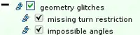 | Hier wird nach Spitzen in Wegen gesucht und geprüft, ob turn restrictions (Abbiegebeschränungen bzw. Wendeverbote) fehlen: Straßen, die in einem sehr spitzen Winkel aufeinander treffen (explizit oder implizit anhand von Einbahnstraßen), sollten eine Art von Abbiegebeschränkung haben, die das Umfahren der scharfen Mündung verbietet. | |