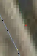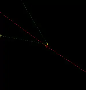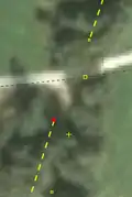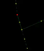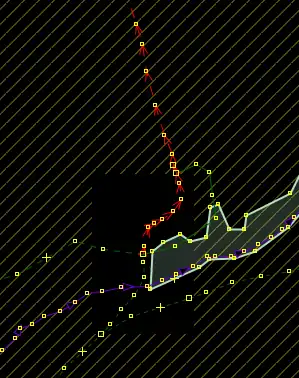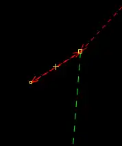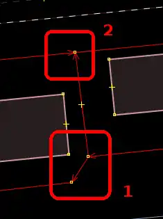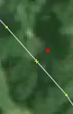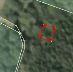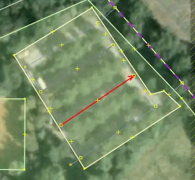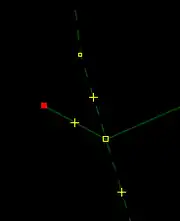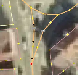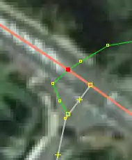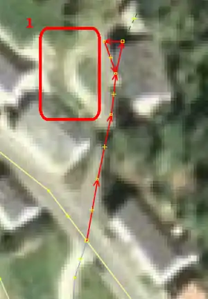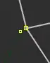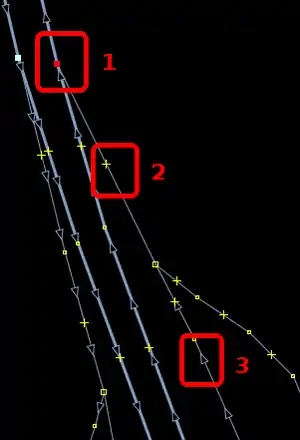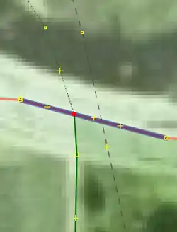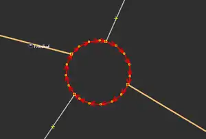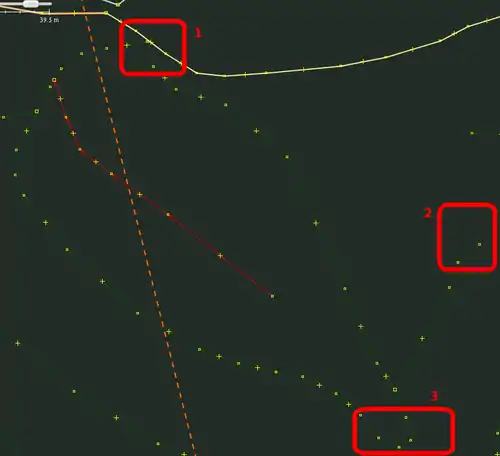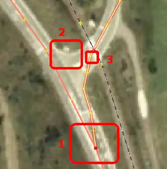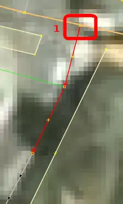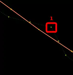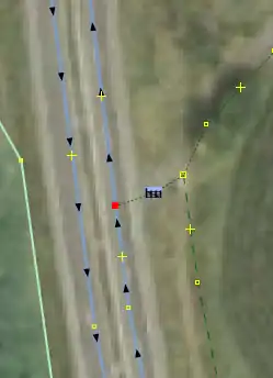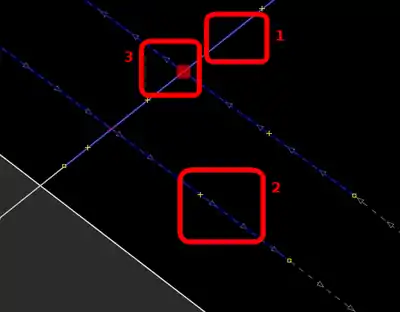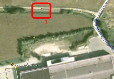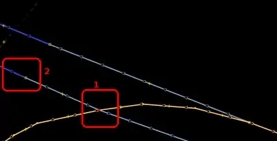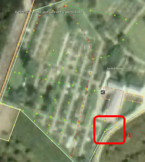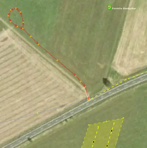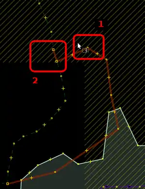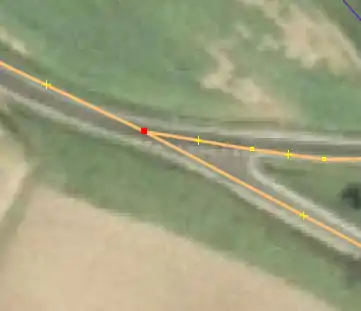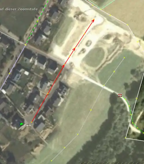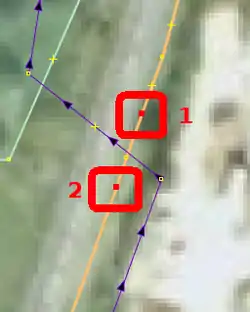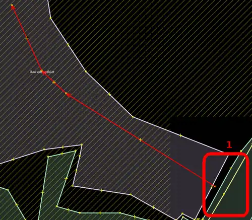 | Bevor man diesen Fehlertyp behebt, sollte man sich vorher mit den beinahe Verbindungen (vgl. Kapitel Beinahe-Verbindungen) beschäftigen, denn mehrere Es ist aber auch möglich, dass sich Wege- und Landschaftsnutzungspunkte überlagern, jedoch nicht miteinander verbunden sind, was vielleicht ganz praktisch wäre, wenn man die Straße verschiebt und die Landschaftsnutzung dementsprechend auch verschoben werden soll. Jedenfalls ist dieser Fehlertyp nicht ohne Weiteres auf Anhieb sichtbar. Man beachte den Unterschied der Punktdicke zwischen (1) und (2) in Abbildung 112. Wenn sich mehrere Um den Fehler nun zu beheben, klickt man am besten mit der linken Maustaste neben die |