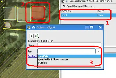 Wenn man beispielsweise den oben angesprochenen Tennisplatz korrekt taggen möchte (1), markiert man diesen (2) und geht im JOSM-Menü auf Vorlagen → Sport → Ballsport → Tennis. Man kriegt nun eine Vorauswahl der Typen amenity- oder leisure-Typen, die zu der jeweiligen Sportart passen (3) (vgl. Abbildung 110). Es ist nämlich unwahrscheinlich, dass Tennis auf einem Golfplatz (leisure=golf_course) gespielt wird.