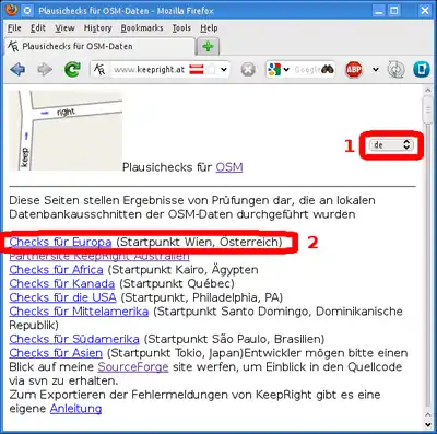 Sollte diese Seite in englischer Sprache (en) angezeigt werden, könnt ihr die Sprache in Deutsch (de) ändern (1) . Wenn ihr Fehler in Europa beheben wollt, klickt ihr auf Checks für Europa (2). Selbstverständlich könnt ihr auch Fehler in anderen Teilen der Welt korrigieren. Es öffnet sich das keepright-Fenster mit den typischen Elementen (vgl. Abbildung 5). Wenn ihr in Zukunft direkt euer Gebiet aufrufen möchtet, müsst ihr ein Lesezeichen in eurem Browser anlegen. Dazu verwendet ihr den Permalink, der im Kapitel Das keepright-Fenster im Punkt (7) näher beschrieben wird. |