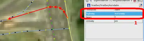 Heißt also, dass es an dieser Stelle (1) wahrscheinlich ist, dass es eine Einbahnstraße ist. Tatsächlich fehlt hier, wie man anhand des Satellitenbildes erkennen kann, eine Abbiegespur nach rechts (2). Dementsprechend kann zur Fehlerbehebung eine weitere Abbiegespur eingezeichnet werden. Beide Abbiegespuren müssen anschließend als Einbahnstraße (oneway=yes) getaggt werden. Eventuell muss hier (3) die eine Abbiegespur vom restlichen Weg getrennt werden (Taste P bzw. JOSM-Menü: Werkzeuge → Linie aufspalten), damit diese unabhängig von der restlichen Straße als Einbahnstraße gekennzeichnet werden kann. |
