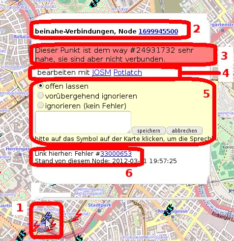 Eben haben wir gelernt, welche Fehlerarten man sich anzeigen lassen kann. Um die genauen Umstände eines Fehlers zu erfahren bzw. um den Fehler zu beheben, müssen wir mit der Maus über den Blitz fahren (1) (vgl. Abbildung 5). Damit diese Sprechblase auf dem Kartenfenster dauerhaft geöffnet bleibt, klicken wir einmal mit der linken Maustaste auf den Blitz.