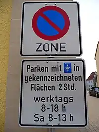 | traffic_sign=DE:1040-33 | Verkehrszeichen: Parken mit Parkscheibe in gekennzeichneten Flächen 2 Stunden | maxstay=2 hours | |