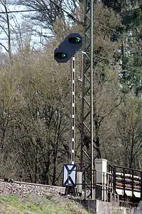 In ganz Deutschland bei Neubauten verwendet. Hat immer ein gelbes, aber niemals ein rotes Licht. Mit rotem Licht ist es ein Ks-Kombinationssignal (railway:signal:combined=DE-ESO:ks), ohne gelbes Licht ein Ks-Hauptsignal (railway:signal:main=DE-ESO:ks). Wenn das grüne Licht blinkt ist auch ein Zs3v-Signal vorhanden, das eine Geschwindigkeit anzeigt (railway:signal:speed_limit_distant=DE-ESO:zs3v). Bei verkürztem Bremswegabstand leuchtet oben links ein weißes Zusatzlicht (railway:signal:distant:shortened=yes). Bei einem Vorsignalwiederholer leuchtet unten rechts ein weißes Zusatzlicht (railway:signal:distant:repeated=yes), wie im Beispiel zu sehen. Das zugehörige Hauptsignal ist im Bild das nächste Signal rechts. Im Beispiel ist ein Geschwindigkeitsvorsignal railway:signal:speed_limit_distant=DE-ESO:zs3v am selben Mast montiert. Das zugehörige Hauptsignal trägt auch das zugehörige Geschwindigkeitssignal. | |