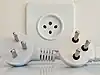 französischer Stecker domestic socket used in France, Belgium, Morocco, Tunisia, Poland, Czech Republic, Slovakia, Monaco. IEC type E, or CEE 7/5 socket (taking a CEE 7/6 or CEE 7/7 plug), 220–230 V AC, 16 A.Slovakia, Monaco. | ||
