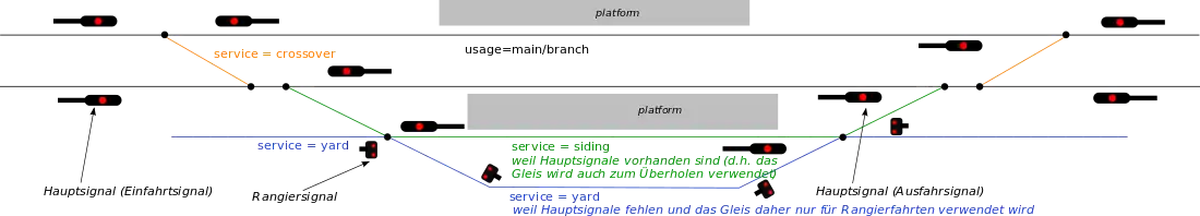 Innerhalb von Bahnhöfen werden nur die durchgehenden Hauptgleise mit usage=* getaggt; nicht durchgehende Hauptgleise (wie Überholgleise und Ausweichgleise) erhalten stattdessen service=siding, Gleise zum Überleiten zwischen den Streckengleisen service=crossover sowie Nebengleise (Abstell- und Ladegleise) service=yard bzw. service=spur.