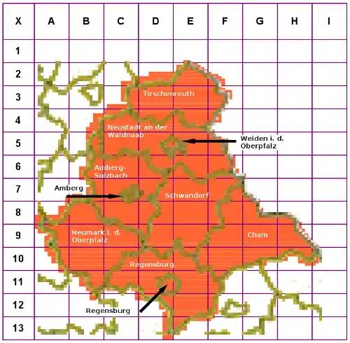 Um der Orientierung willen und damit keine Gebiete vergessen werden, steht hier ein Matrix über die ganze Fläche der Oberpfalz zur Verfügung. Alle Flächen müssten sich überlappen (getestet in JOSM) und damit sollte es zur lückenlosen Erfassung dienen.