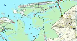 - Fahrwasserflächen farblich hervorgehoben (helleres blau).