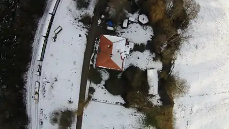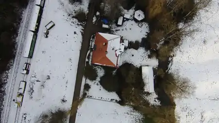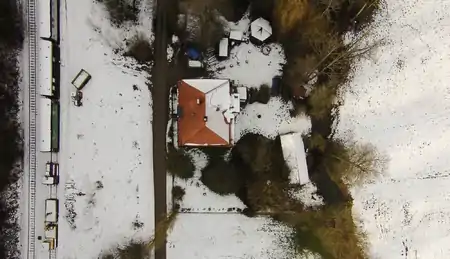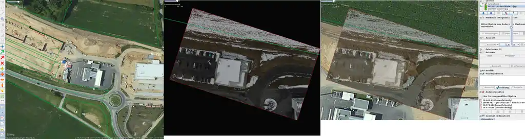 Ich habe zuerst versucht, das Drohnen-Bild so zu skalieren und rotieren, dass es etwa Deckungsgleich mit den bing-Bildern ist. Zur Orientierung diente v.a. das Dach des roten Hauses sowie das Dach des Schuppen in der rechten Bildhälfte. Die OSM-Daten des roten Hauses sind eher miserabel (ich habe sie vor Jahren selber eingezeichnet ;). Der große runde Kreis oberhalb des Hauses deckt sich bei bing, beim Drohnen-Bild aber nicht.