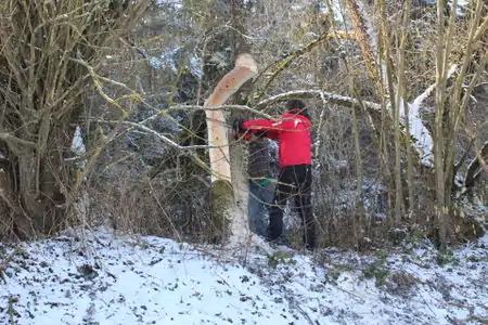 Gestern Abend, bei einer winterlichen Vollmondnacht, hatte ich die sehr gute Idee, eine Taschenlampe an eines der Landegestelle zu befestigen. Das Flugverhalten der Drohne war erwartungsgemäß etwas unruhig. Ich dachte aber, ich könnte das durch die Steuerung ausgleichen. Jedoch nach bereits wenigen Flugmetern ist mir die Kontrolle fast komplett verloren gegangen und ich wollte sie nur noch nach oben bringen, um den Bäumen auszuweichen. Leider war dann 'oben' durch die Schräglage nicht mehr oben, sondern hat zu einem erstklassigen Parabelflug geführt, direkt in die Spitze eines ca. 25 Meter hohen Baums. Der Aufprall war so heftig, dass der Akku rausgeflogen ist, die Drohne aber hat sich in den Ästen verhakt. Raufklettern ging nicht, Schütteln half nichts. Was tut man? Man greift zur Kettensäge ;) Die Fallrichtung wurde so ausgewählt, dass die Drohne möglichst 'sanft' auf den darunterliegenden zuerst aufschlagenden Zweigen abgefedert wird! Nach Bergung der Drohne und Schadensbegutachtung stellt sich heraus: Der Rotor-Protektor ist total zerborsten (gut, dass der dran war), genauso wie ein Rotor. Glücklicherweise, wie durch ein Wunder, hat die Kamera und der Gimbal keinen Schaden genommen. Ein erster Probelauf (ohne Abheben) hat auch gezeigt, dass die Motoren alle gleichmäßig laufen. Also nochmal Glück im Unglück.