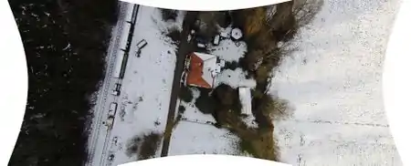 Für einen ersten Test habe ich einen Flug über mein Haus gemacht. Das folgende Bild wurde aus ca 50m Höhe erstellt. Was sofort auffällt ist die starke Verzerrung der Weitwinkel-Linse. Ohne das zu kompensieren kommt man erstmal nicht weiter. Ausserdem braucht man ausreichend Bildmaterial, damit man eine senkrechte Draufsicht bekommt. Einzelbilder werden alle 3 Sekunden erstellt, was bei einer bewegten Drohne etwas Glück erfordert.