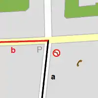 - Das exakte Rendern von Gebotsschildern statt Verbotsschildern ist mit der oben gewählten 1:1-Beziehung zwischen englischem type und dem entsprechenden Gebotszeichen nicht möglich. Beispielsweise müsste ein no_right_turn an einer Kreuzung, wie dargestellt, durch ein Gebotszeichen geradeaus und links dargestellt werden, bei einer nach rechts abgehenden Einmündung dagegen durch ein nur geradeaus. Dies entspricht dann auch der in der Realität üblicherweise gewählten Beschilderung. Mit der oben gewählten, sehr viel einfacher umzusetzenden 1:1-Beziehung, wird dann aber an Einmündungen bei der (zulässigen) Abbildung der Situation durch ein Verbot ein Schild mit Pfeil in eine nicht vorhandene Straße (im Beispiel nach links) dargestellt.