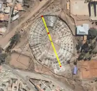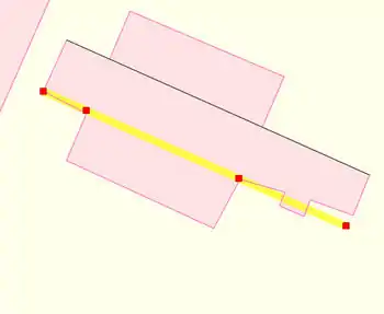 Entlang der längsten Kante des Umrisses (wahrscheinlich ist sie richtig gezeichnet, weil auf dem Luftbild am besten sichtbar)ziehen wir eine Hilfslinie (schwarz) die 4 gemeinsame Punkte mit dem Grundriß hat. Diese Linie wird wie im vorherigen Abschnitt begradigt mit dem Befehl "straighten way".