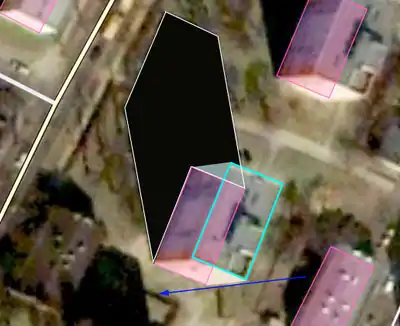 Bei frei stehendem Gebäude ohne Bezug zur Straße wird der Lagefehler verringert, indem man als Lage des Umrisses nach der Verschiebung den halben Abstand zwischen der niedrigsten und höchsten auf dem Luftbild sichtbaren Gebäudeecke am Gelände wählt.