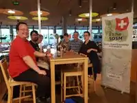 Zum unverbindlichen Anmelden sich unten einfach selber eintragen. Natürlich kann man (normalerweise) auch spontan und ohne Anmeldung ans Treffen kommen. Meist ist irgendwo ein kleines OSM Logo aufgestellt auf dem Tisch (nicht so gross wie auf dem Bild oben).