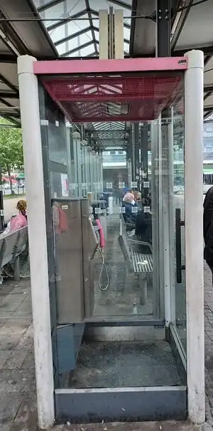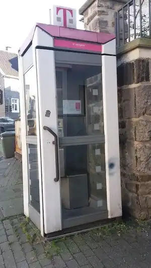 ![]() Eine Telefonzelle des Typs TelH 90 Sm. Man beachte die Unterschiede zum Bild des anderen Typs von Telefonzelle (weiter oben), z. B. die runden Ecken. |