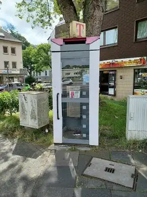 ![]() Eine Telefonzelle des Typs TelH 90. ![]() Dieser Standort ist mit einem WLAN-Hotspot ausgestattet, was der Aufkleber im oberen Bereich der Zelle anzeigt. Manchmal fehlt dieser Aufkleber aber auch und es gibt trotzdem WLAN. |